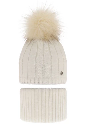 Czapka i komin dla dziewczynki zimowy komplet, kremowy, z pomponem Amaltea