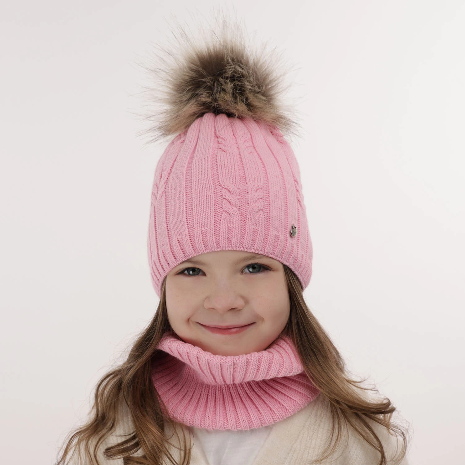 Urocza czapka Amaltea zachwyca detalami - śliczna metalowa zawieszka nadaje jej ekskluzywnego charakteru, a mięciutki pompon z ekofutra przyciąga spojrzenia. Prążkowany wzór nadaje całości modnego wyglądu, który pokocha każda dziewczynka.
