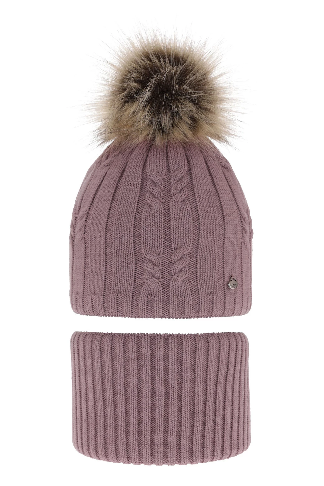 Czapka i komin dla dziewczynki zimowy komplet, wrzosowy, z pomponem Amaltea