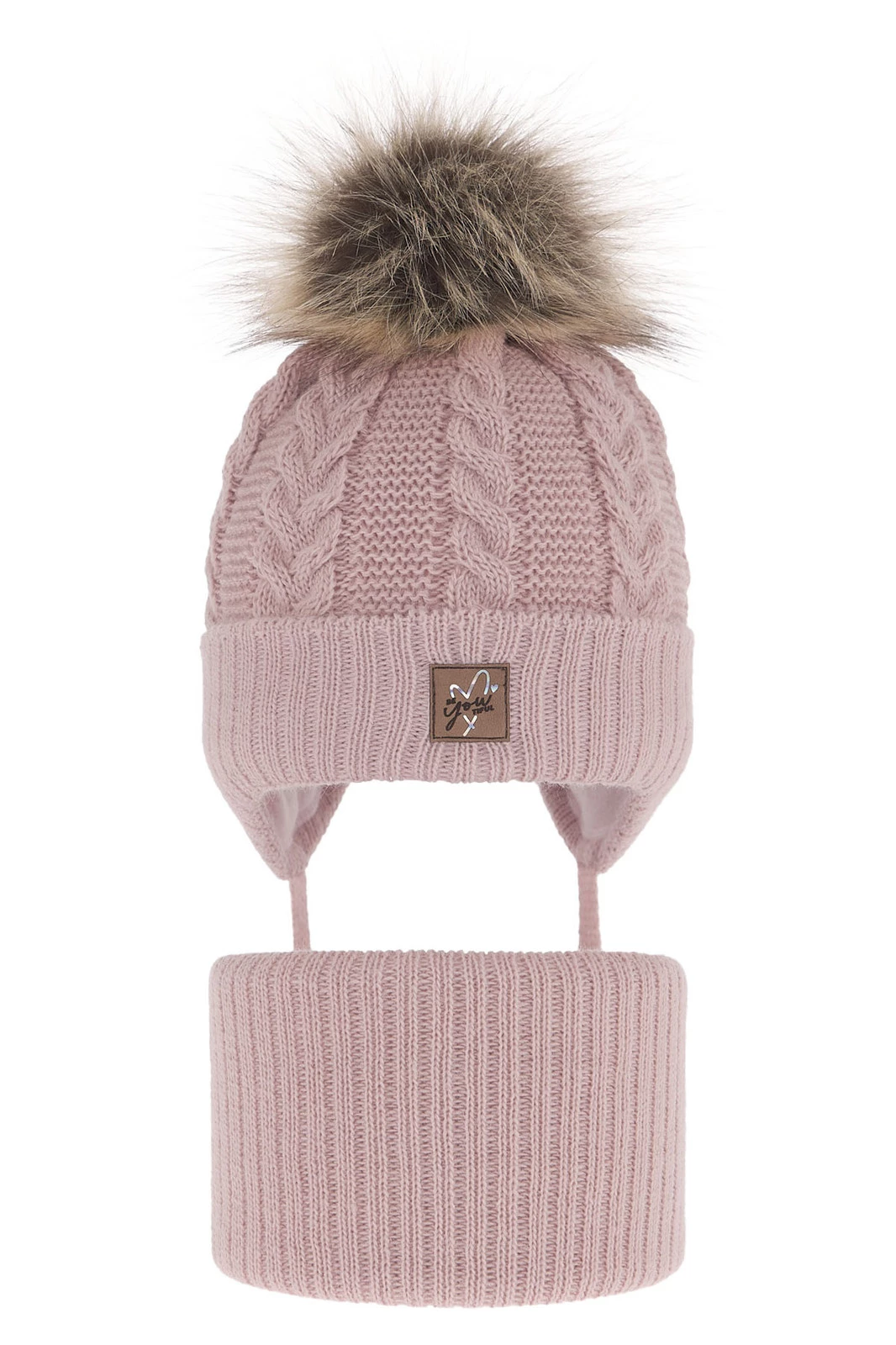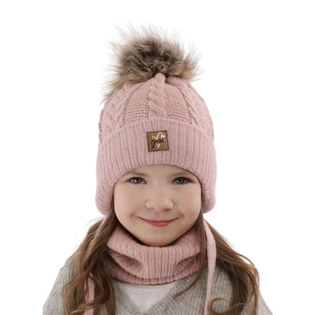 Czapka i komin dla dziewczynki zimowy komplet, różowy, wiązany, z pomponem Finess