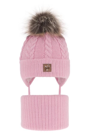 Czapka i komin dla dziewczynki zimowy komplet, różowy, wiązany, z pomponem Finess