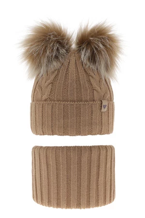 Czapka i komin dla dziewczynki zimowy komplet, camel, z dwoma pomponami Amala