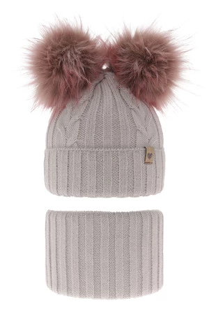 Czapka i komin dla dziewczynki zimowy komplet, szary, z dwoma pomponami Amala