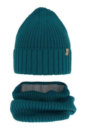Komplet zimowy dla dziewczynki Mesalia wykończono uroczą naszywką, która nadaje całości dziewczęcego charakteru. Prążkowany splot nie tylko wygląda elegancko, ale również zwiększa elastyczność materiału, dzięki czemu czapka i komin doskonale dopasowują się do kształtu głowy i szyi.