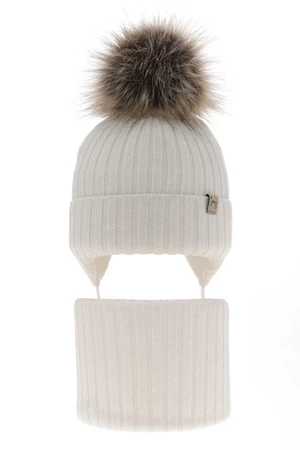 Czapka i komin dla dziewczynki zimowy komplet, biały, 100% wełniana merino, wiązany Junika