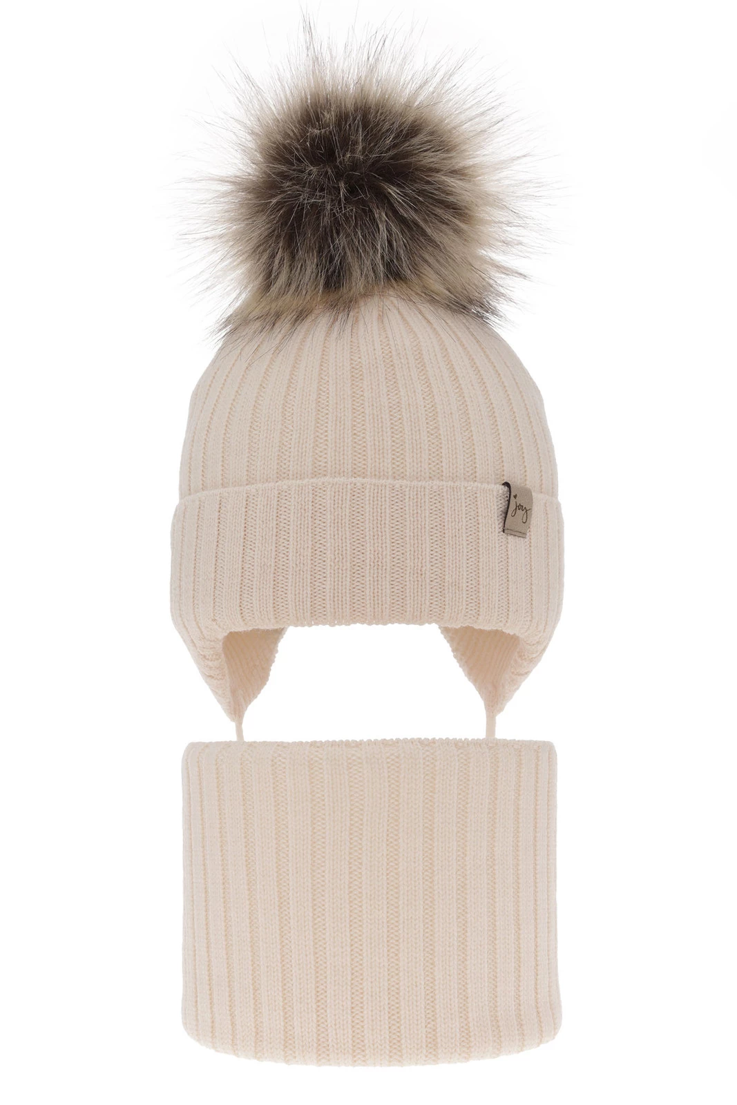 Czapka i komin dla dziewczynki zimowy komplet, jasnobeżowy, wiązany, 100% wełniany merino, z pomponem Junika