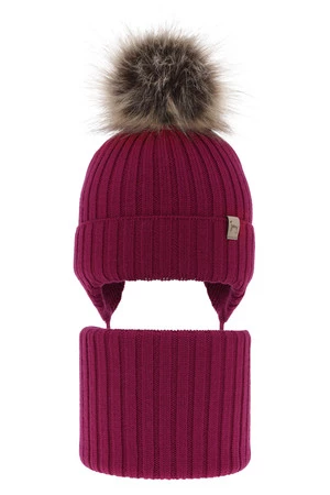 Czapka i komin dla dziewczynki zimowy komplet, fuksja, wiązany, 100% wełniany merino Junika