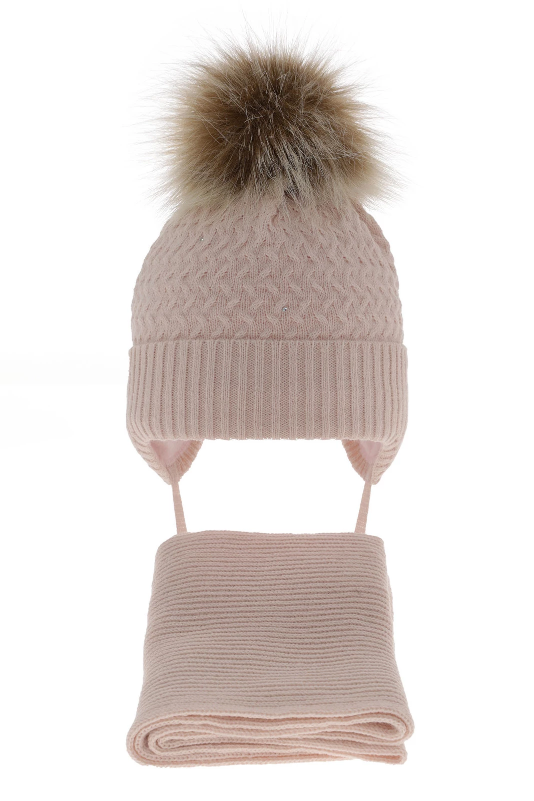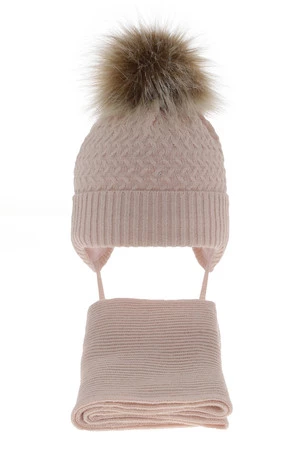 Czapka i szalik dla dziewczynki zimowy komplet, jasnoróżowy, z pomponem, wiązany Zelta