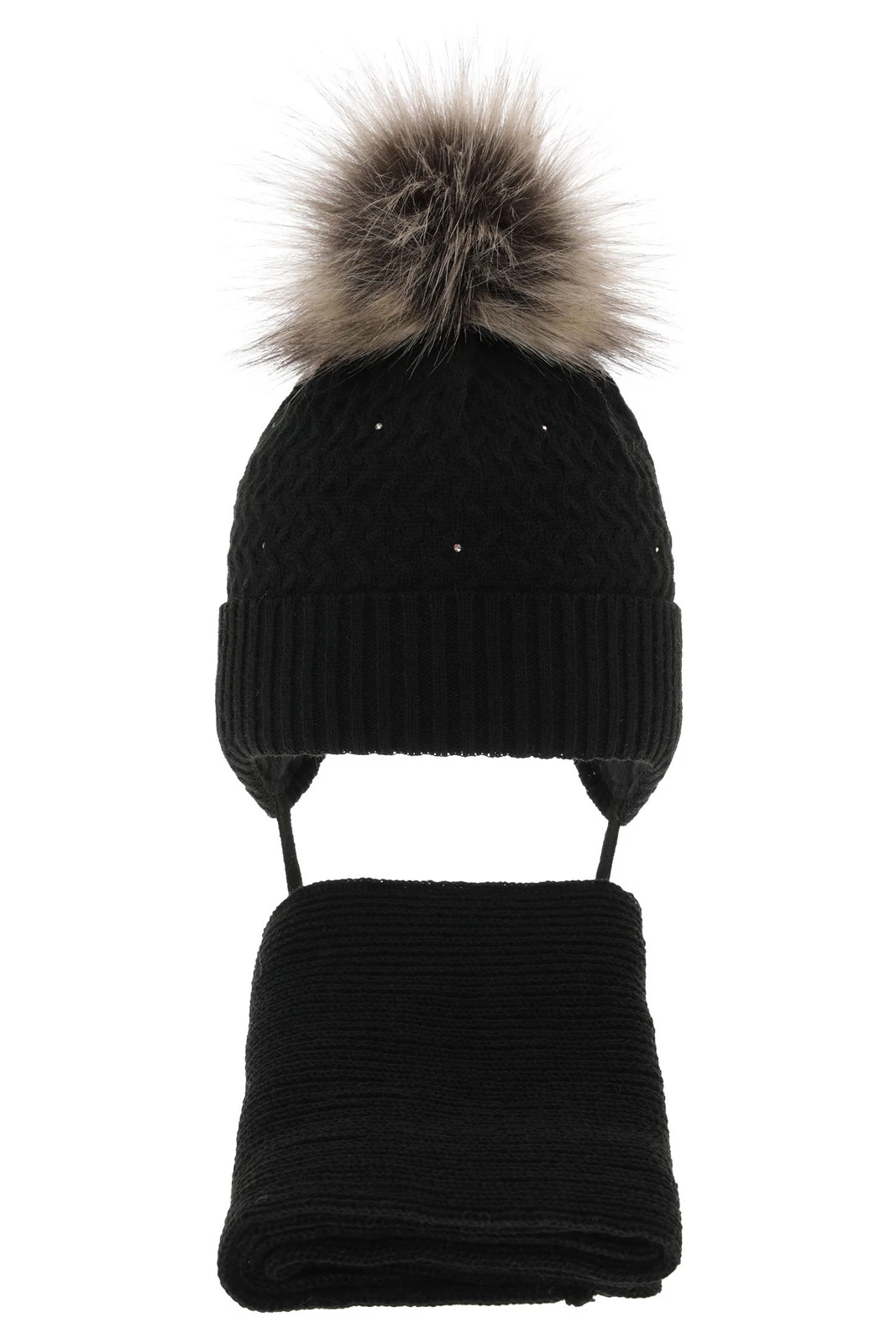 Czapka i szalik dla dziewczynki zimowy komplet, czarny, z pomponem, wiązany Zelta
