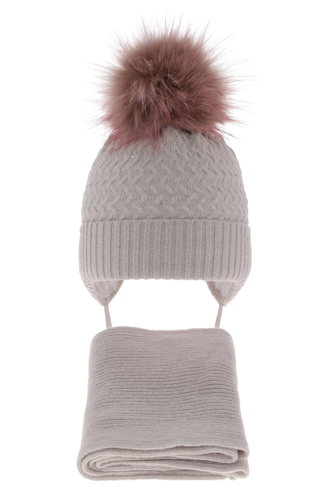 Czapka i szalik dla dziewczynki zimowy komplet, szary, z pomponem, wiązany Zelta