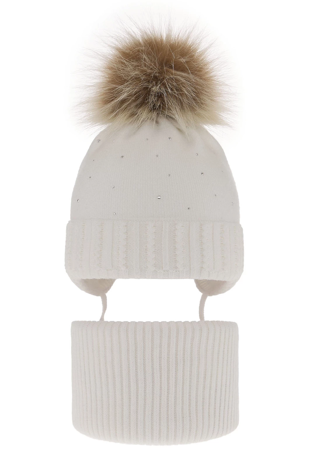 Czapka i komin dla dziewczynki zimowy komplet, biały, z pomponem Renia