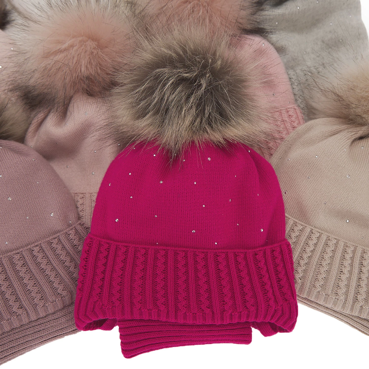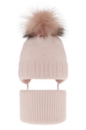 Czapka i komin dla dziewczynki zimowy komplet, jasnoróżowy, wiązany, z pomponem Renia