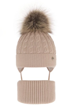 Czapka i komin dla dziewczynki zimowy komplet, beżowy, z pomponem, wiązany Tukana