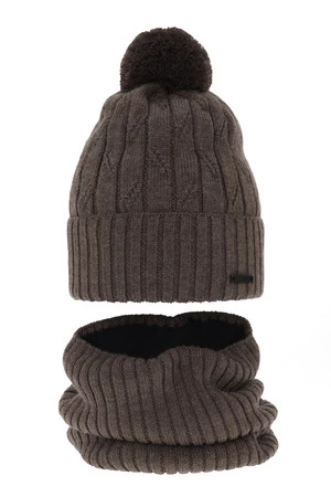 Czapka i komin dla chłopca zimowy komplet, brązowy, z pomponem, wełniany merino Talar