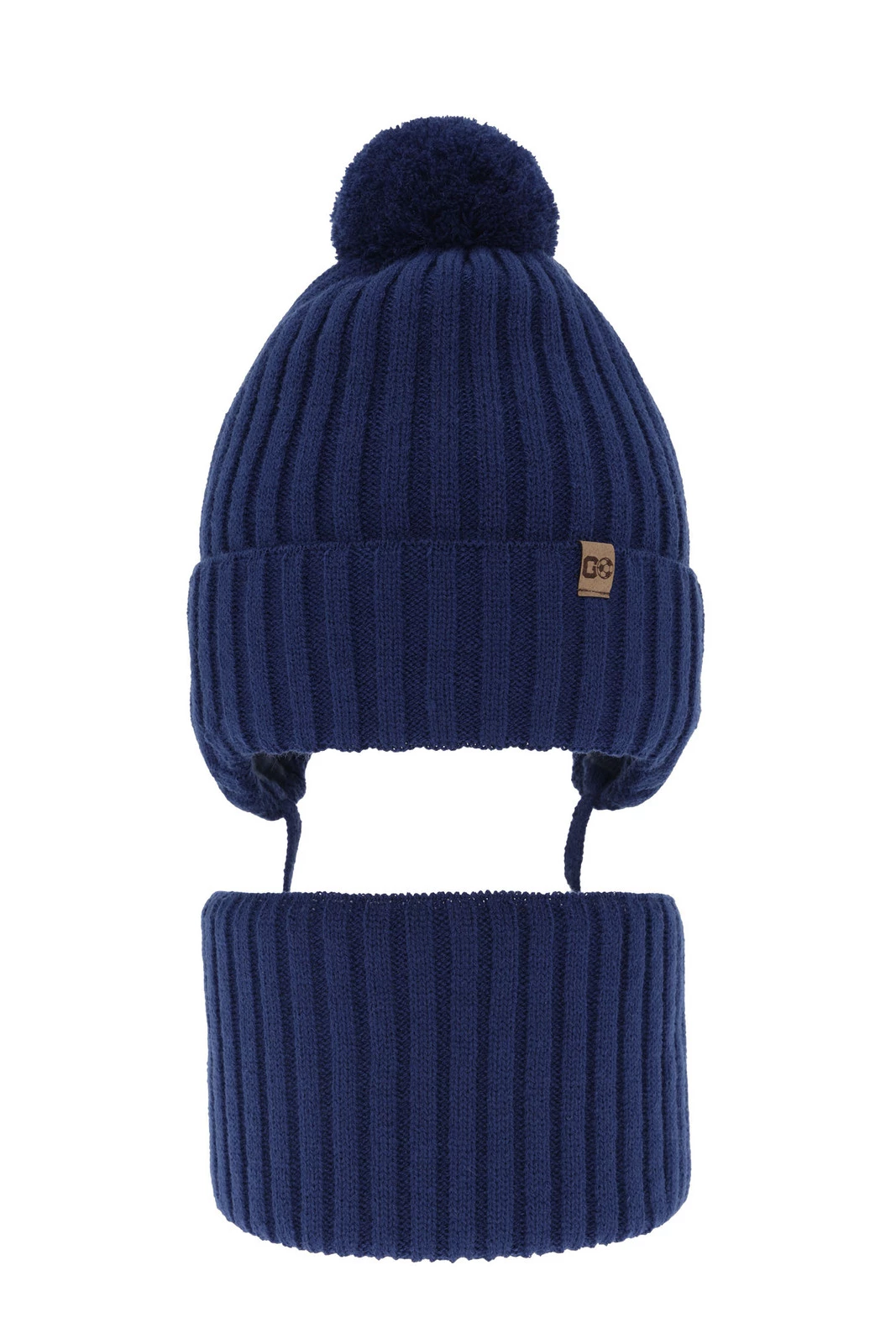 Czapka i komin dla chłopca zimowy komplet, ciemnoniebieski, z pomponem, wiązany Carlo