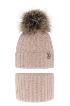 Czapka i komin dla dziewczynki zimowy komplet, beżowy, z pomponem Pretoria