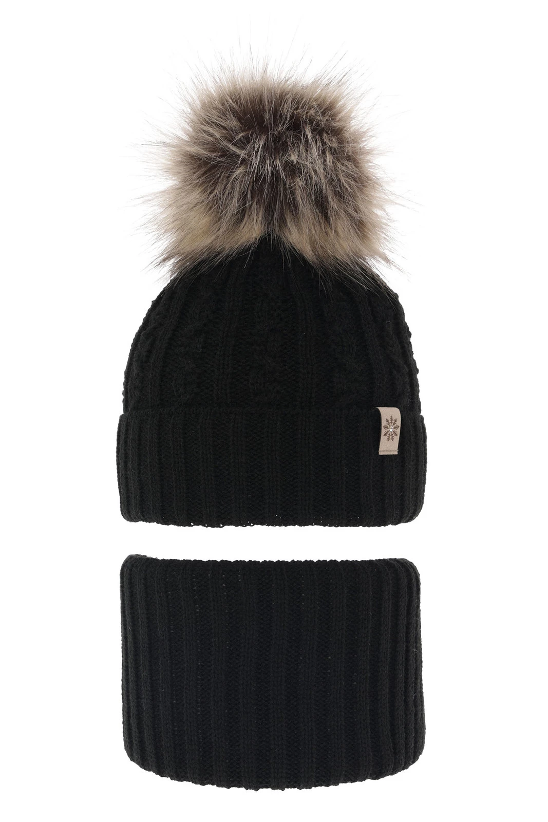 Czapka i komin dla dziewczynki zimowy komplet, czarny, z pomponem Pretoria