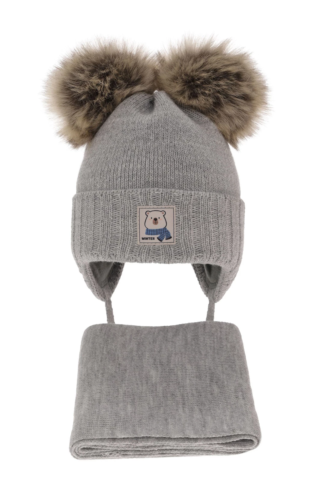 Czapka i szalik dla chłopca zimowy komplet, szary, z dwoma pomponami, wiązany Jewel