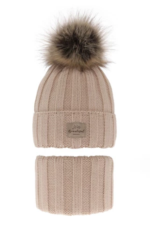 Czapka i komin dla dziewczynki zimowy komplet, beżowy, z pomponem Kaliope