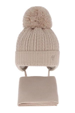Czapka i szalik dla dziewczynki zimowy komplet, beżowy, z pomponem, wiązany Marisa