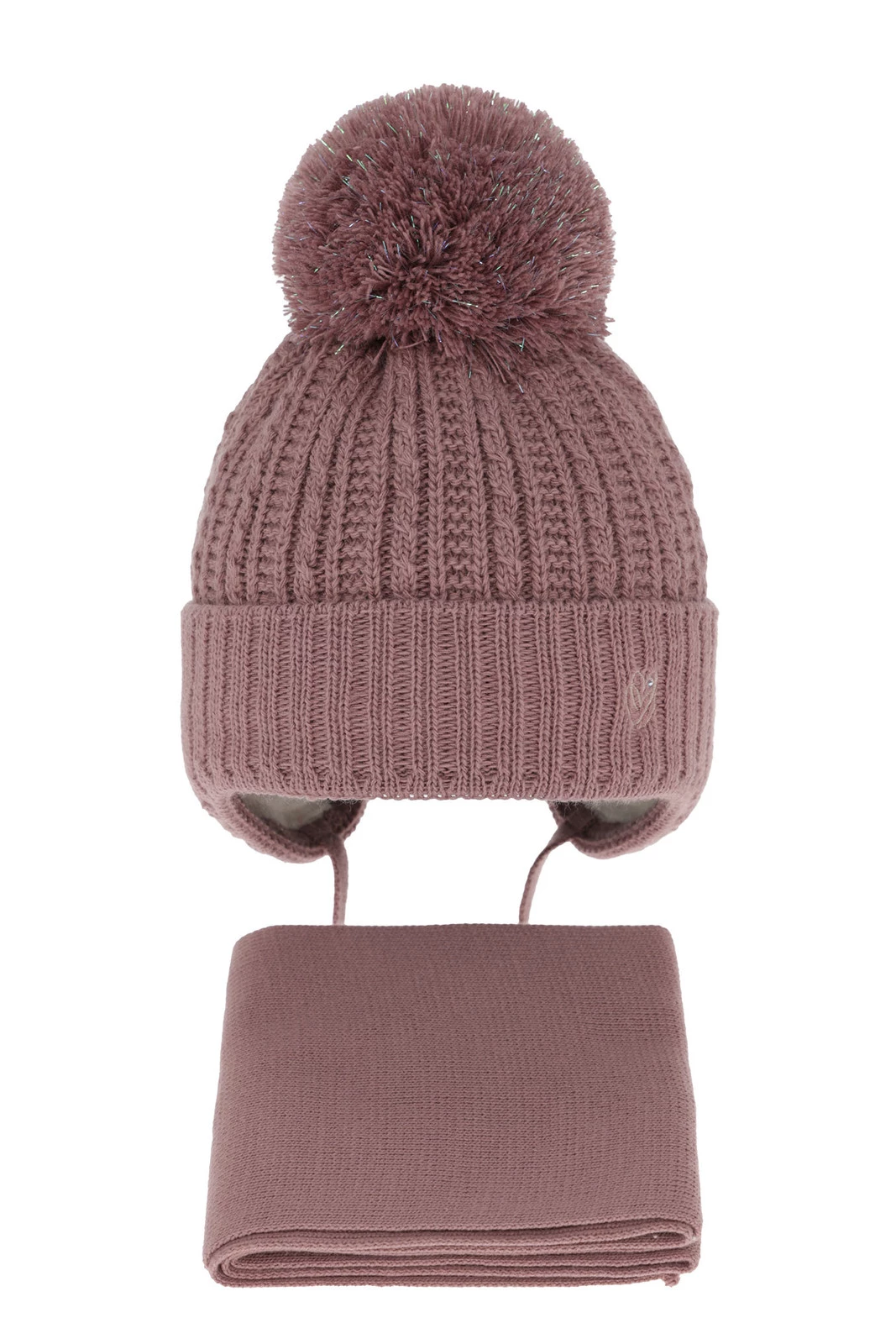 Czapka i szalik dla dziewczynki zimowy komplet, wrzosowy, wiązany, z pomponem Marisa