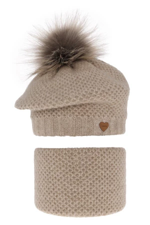 Czapka i komin dla dziewczynki zimowy komplet, beżowy, z pomponem Francesca