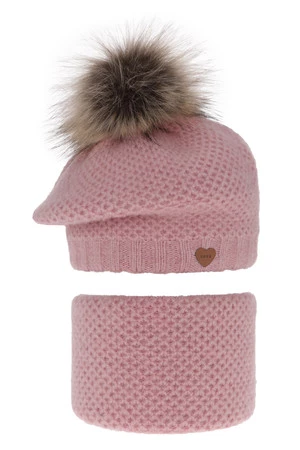 Beret i komin dla dziewczynki zimowy komplet, różowy, z pomponem Francesca