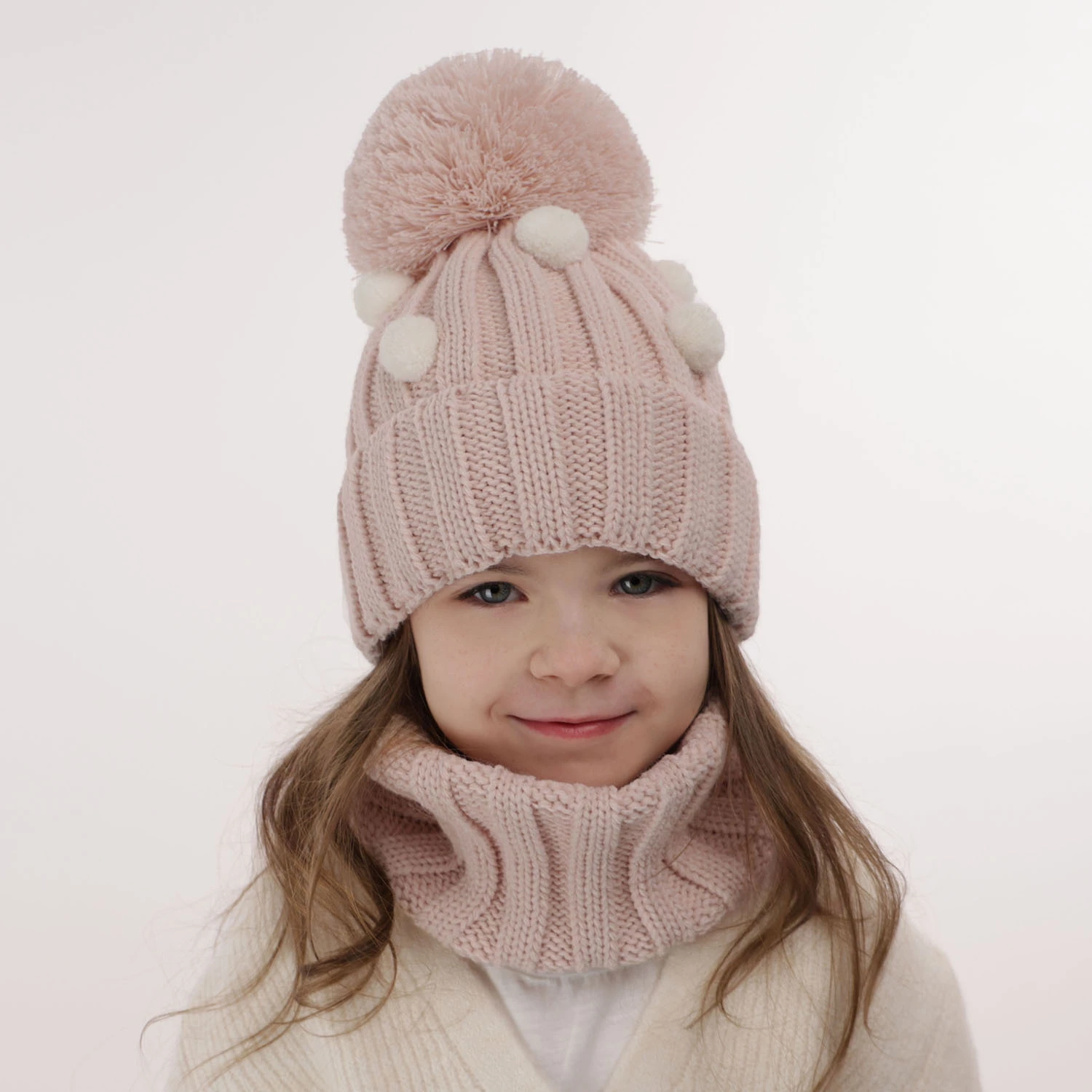 Czapka i komin dla dziewczynki zimowy komplet, różowy, z pomponem Hekate