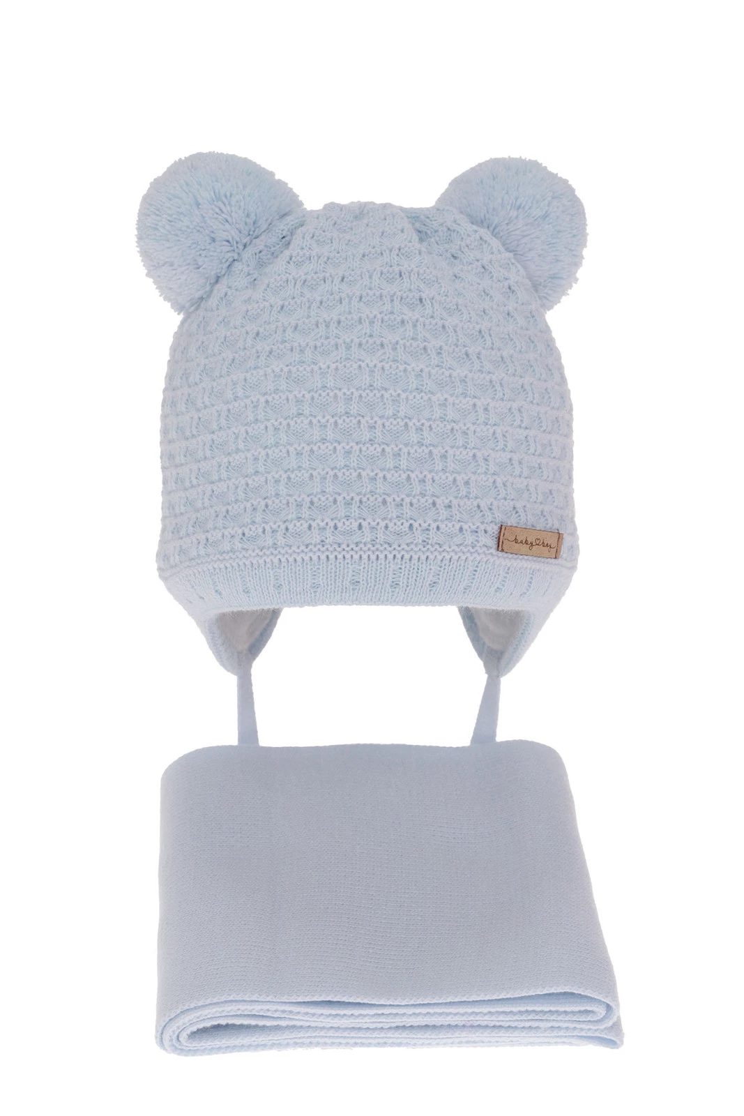 Czapka i szalik dla chłopca zimowy komplet, błękitny, z dwoma pomponami, wiązany Franki