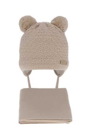 Czapka i szalik dla chłopca zimowy komplet, beżowy, wiązany, z dwoma pomponami Franki