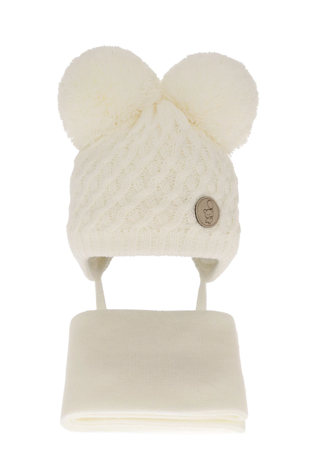 Czapka i szalik dla chłopca zimowy komplet, kremowy, z dwoma pomponami, wiązany Alonso