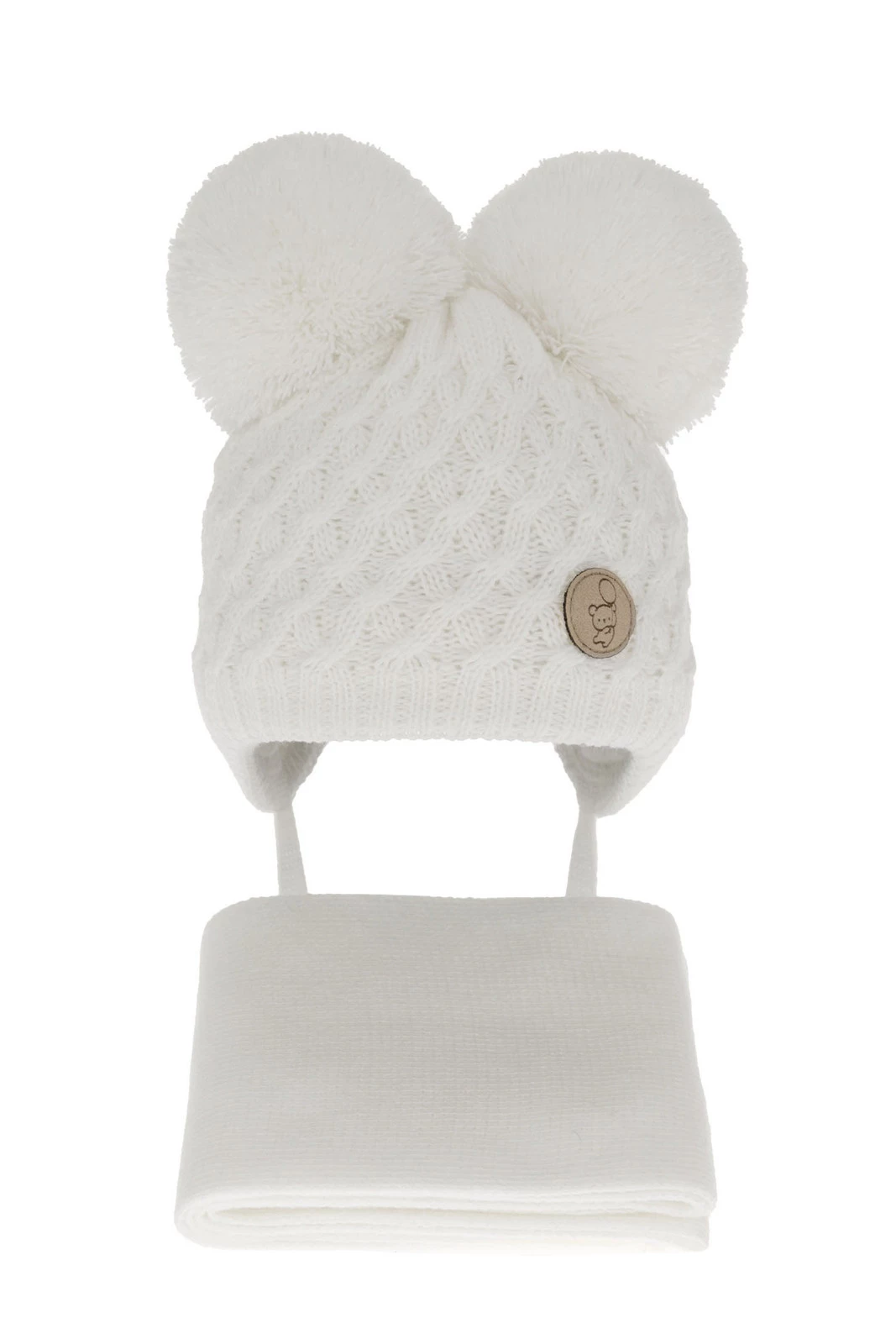 Czapka i szalik dla chłopca zimowy komplet, biały, z dwoma pomponami, wiązany Alonso