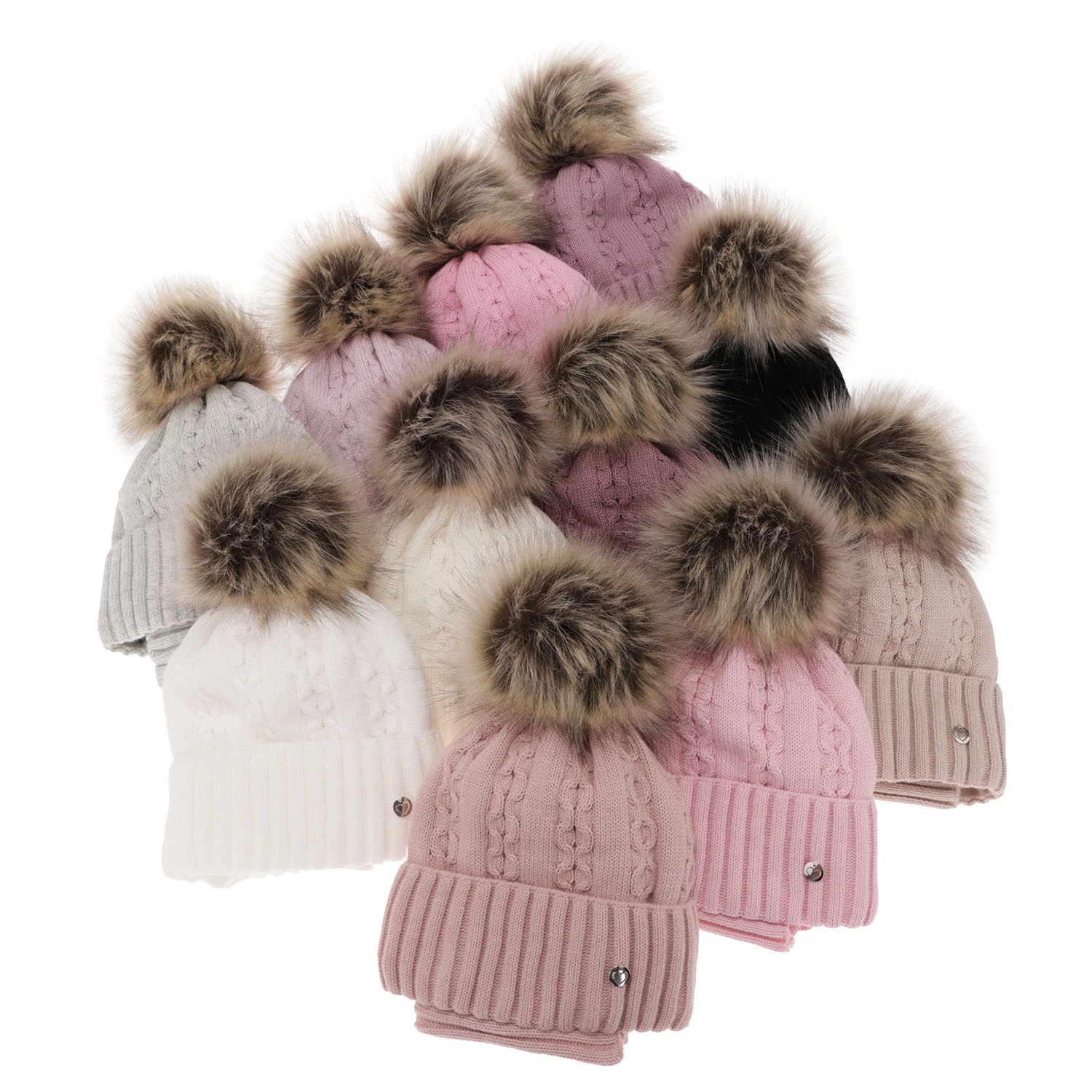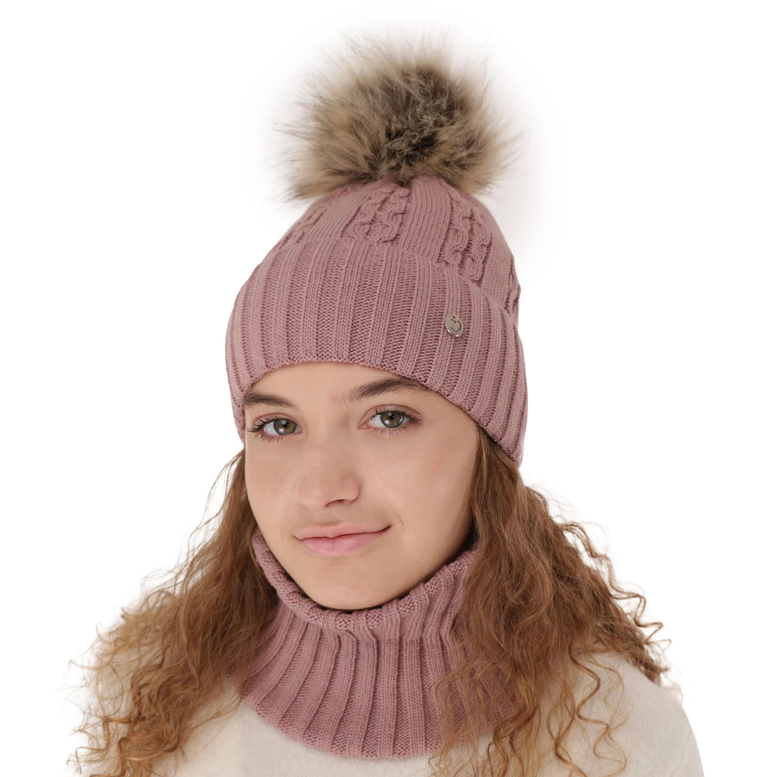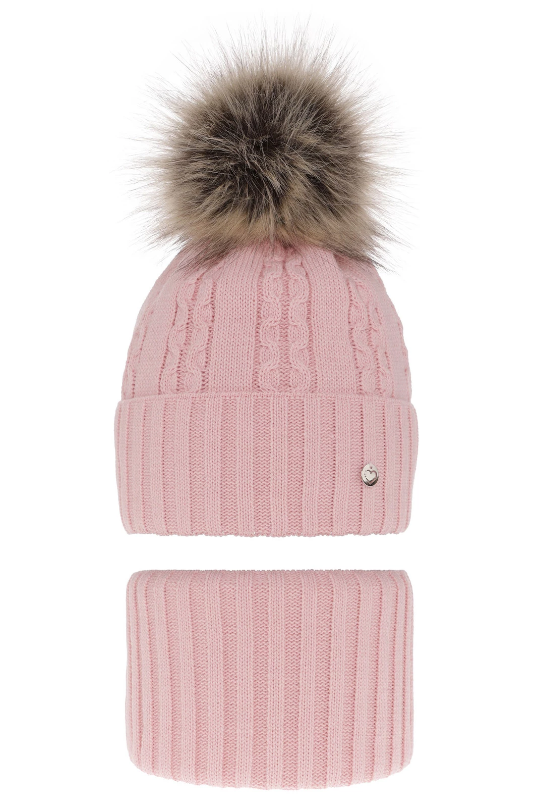 Czapka i komin dla dziewczynki zimowy komplet, różowy, z pomponem Felia