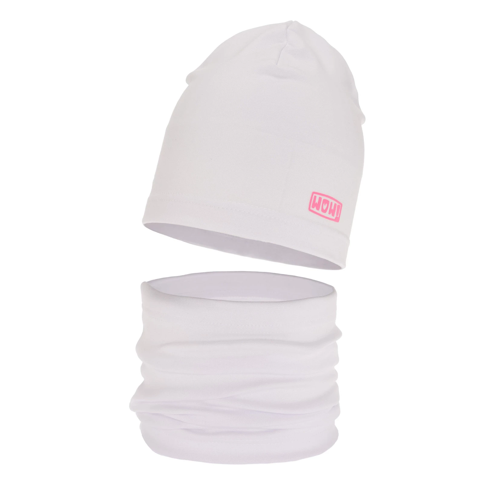 Czapka i komin dla dziewczynki jesienny, wiosenny komplet, biały, bawełniany Friza