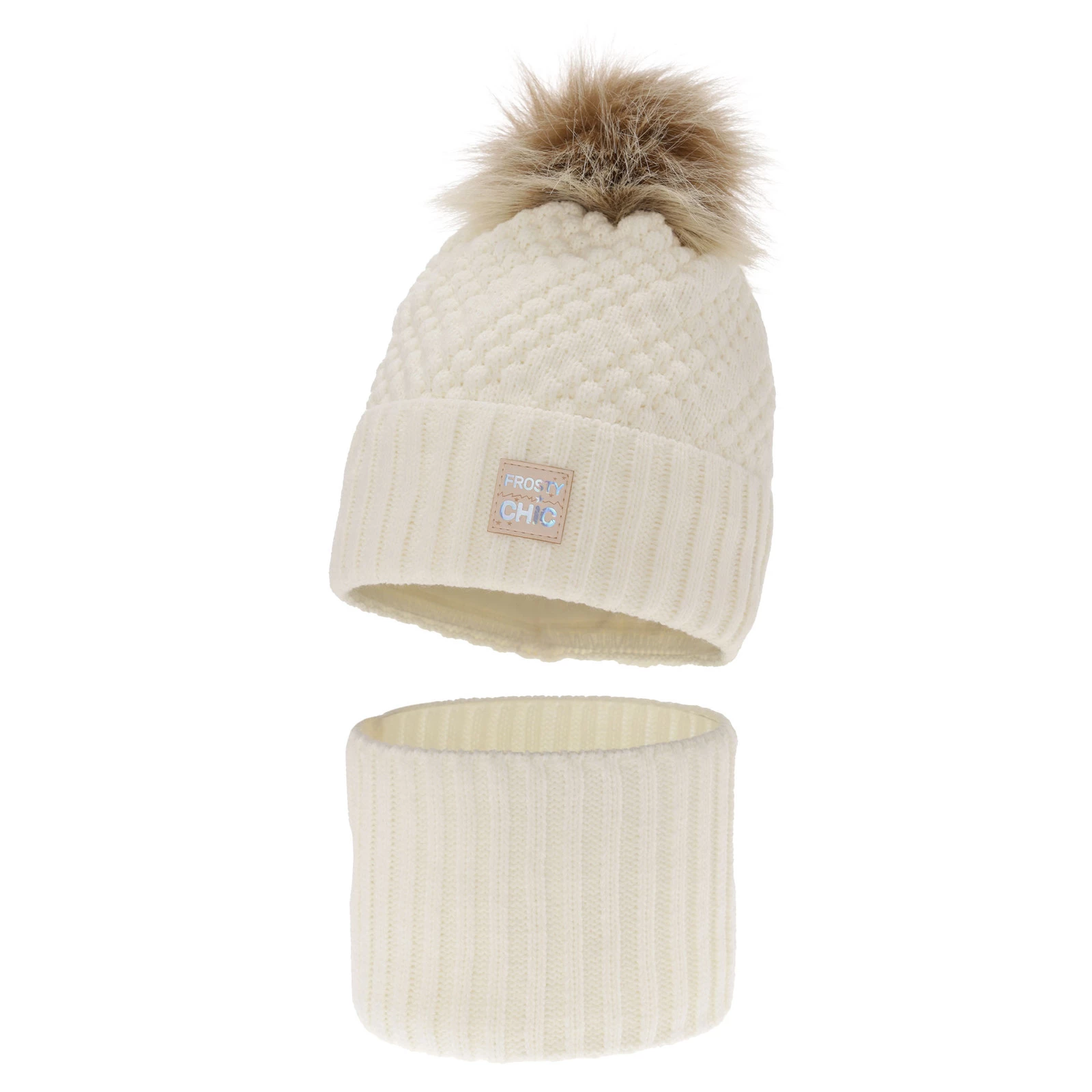 Czapka i komin dla dziewczynki zimowy komplet, kremowy, z pomponem Alena