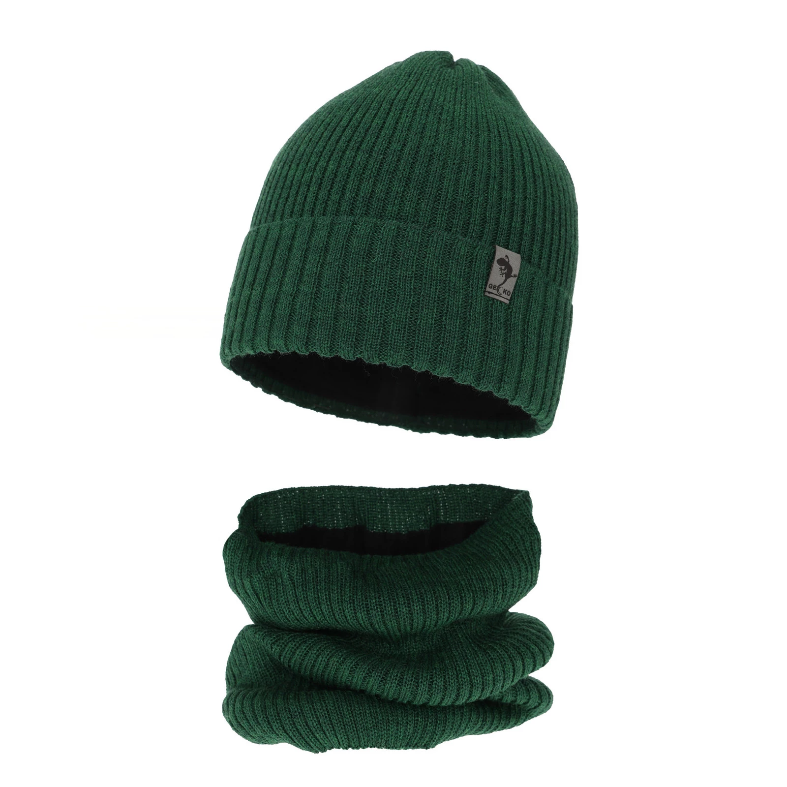 Czapka i komin dla chłopca zimowy komplet, zielony, wełniany merino, podszyty polarem Gecko