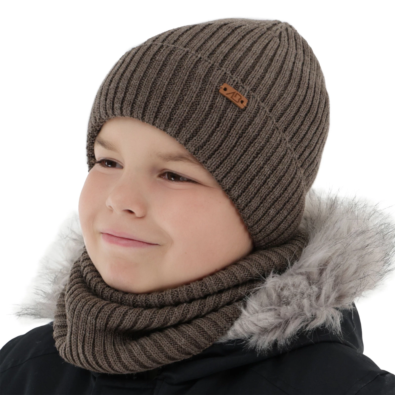 Czapka i komin dla chłopca zimowy komplet, brązowy, z wełną merino, podszyty polarem Palermo