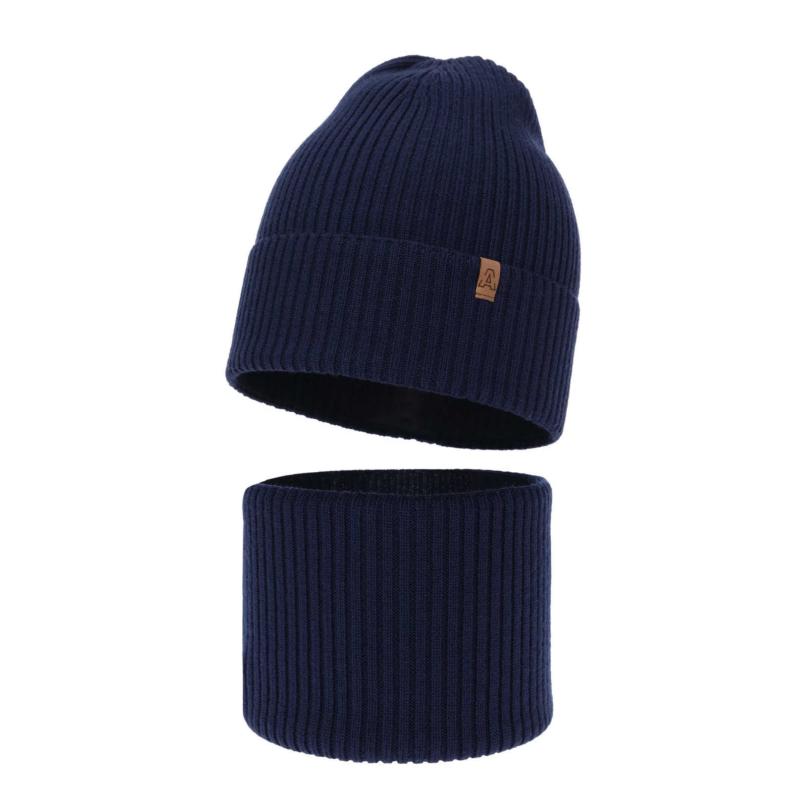 Czapka i komin dla chłopca jesienny, wiosenny komplet, granatowy, 100% wełniany merino Lemas