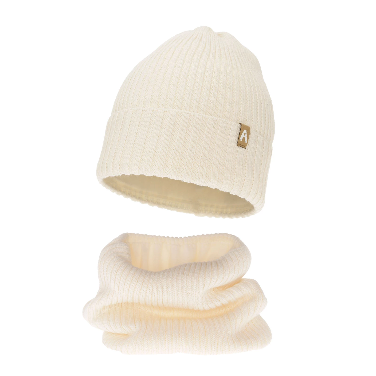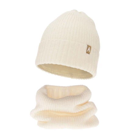 Czapka i komin dla dziewczynki zimowy komplet, kremowy, z wełną merino, podszyty polarem Peggy