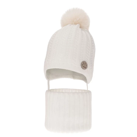 Czapka i komin dla dziewczynki zimowy komplet, biały, z pomponem Kenta