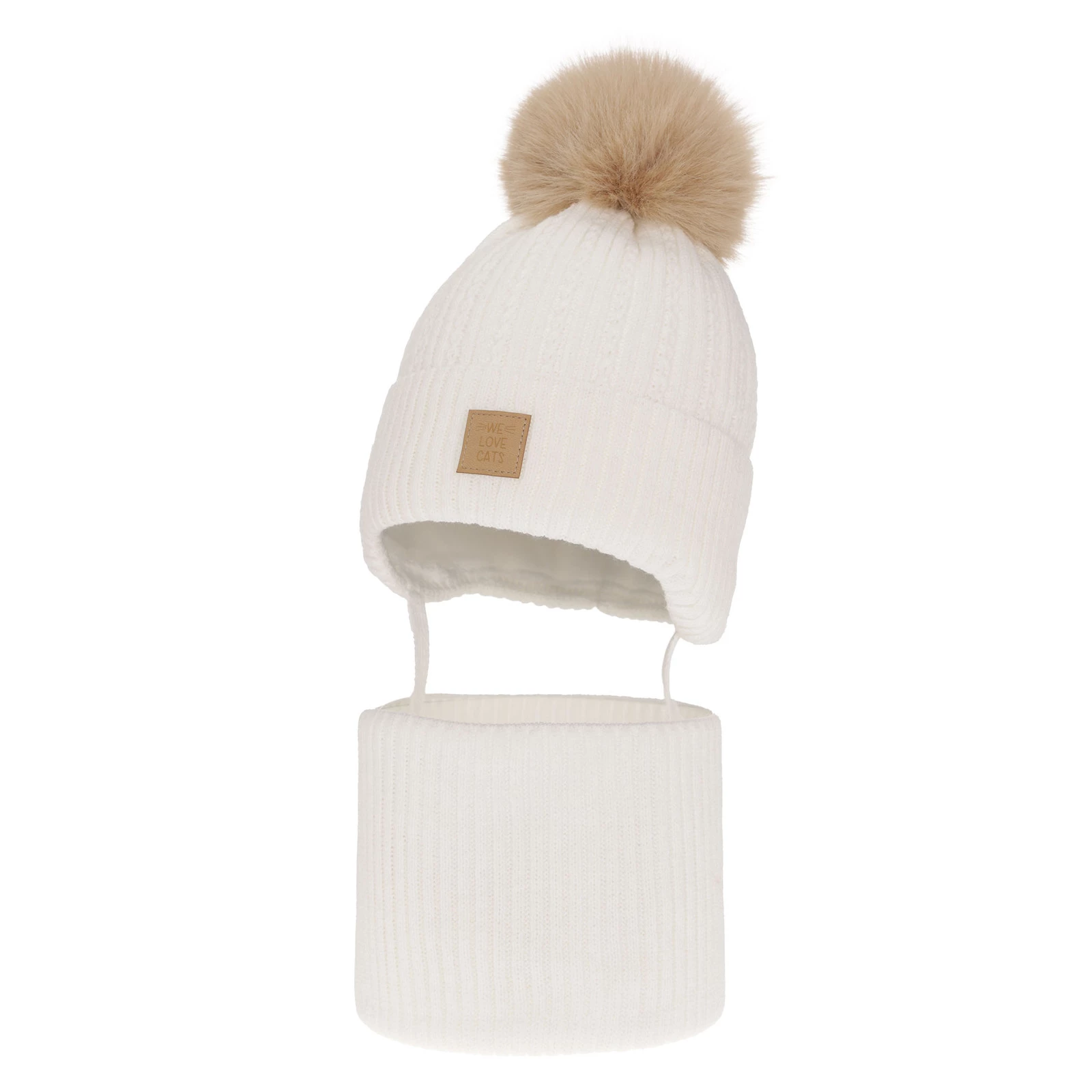 Czapka i komin dla dziewczynki zimowy komplet, biały, z pomponem Betty
