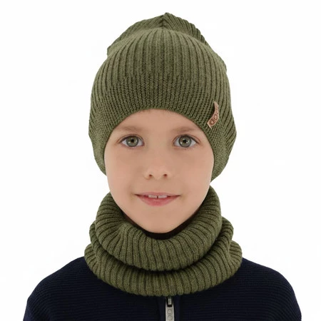 Czapka i komin dla chłopca jesienny, wiosenny komplet, khaki, 100% wełniany merino Chester
