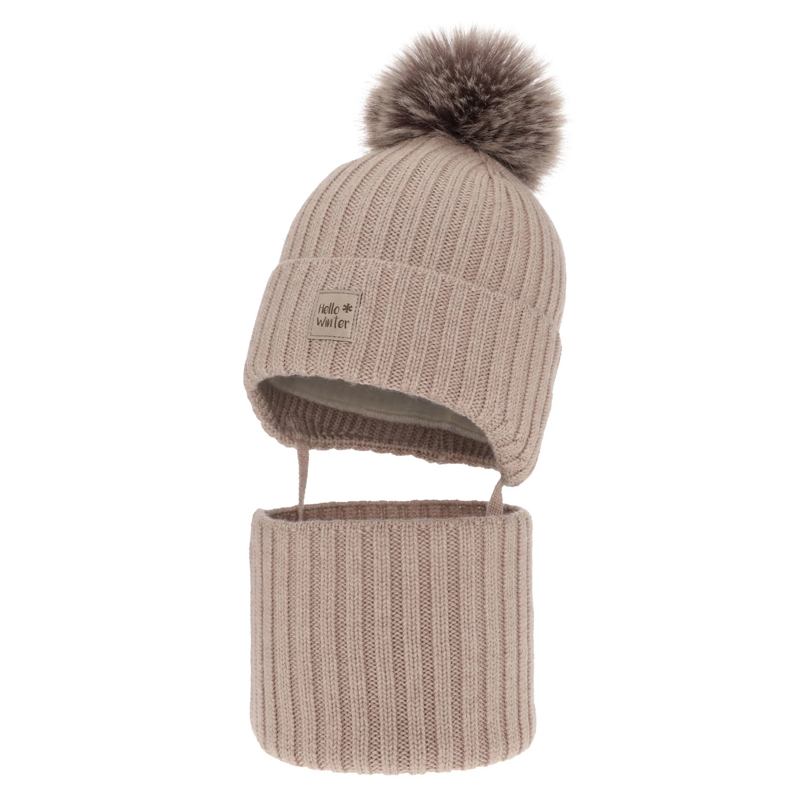 Czapka i komin dla chłopca zimowy komplet, beżowy, 100% wełniany merino, podszyty wełnianym polarem Morti