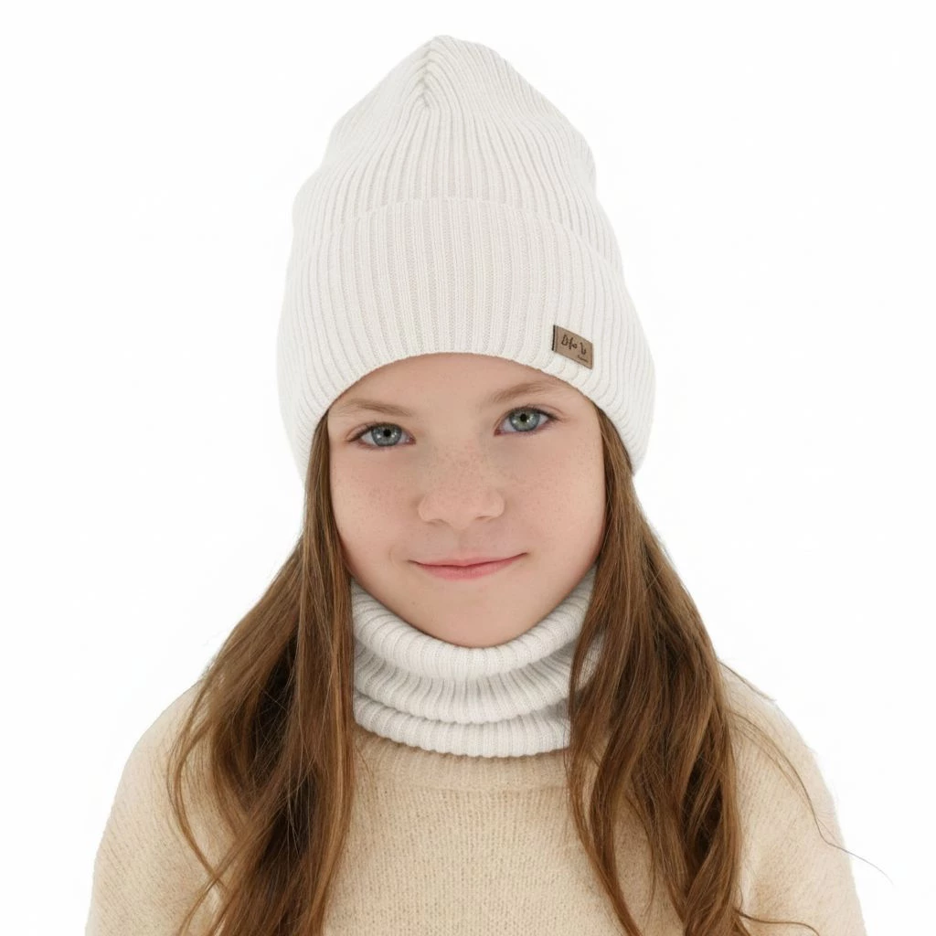 Czapka i komin dla dziewczynki jesienny, wiosenny komplet, biały, 100% wełniany merino Itra