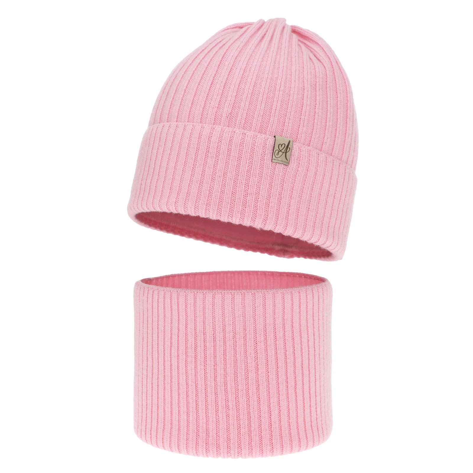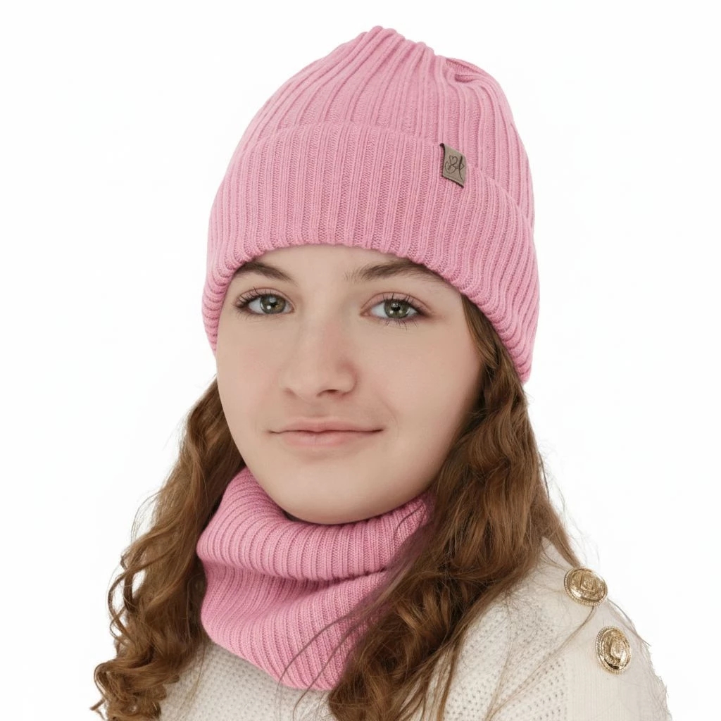 Czapka i komin dla dziewczynki, zimowy komplet, różowy, 100% wełniany merino, Patricia