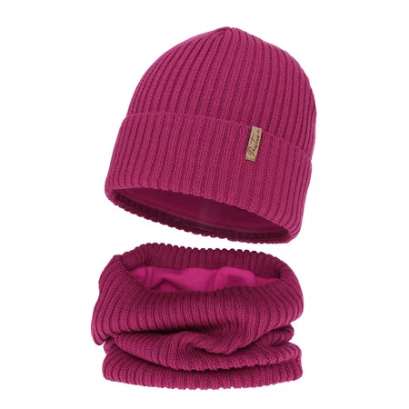 Czapka i komin podszyty bawełną dla dziewczynki zimowy komplet, amarantowy, z wełną merino, Odette