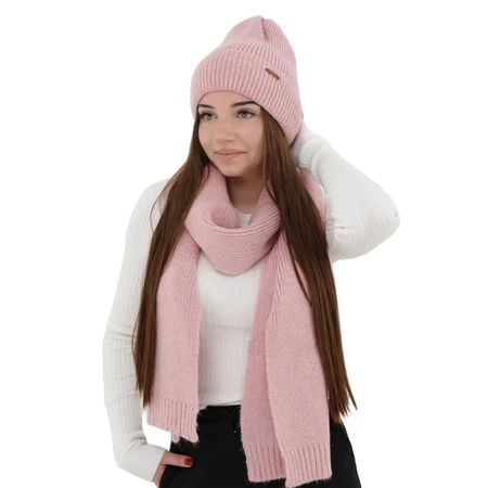 Czapka i szalik damski, zimowy komplet, różowy, z wełną merino, Seala