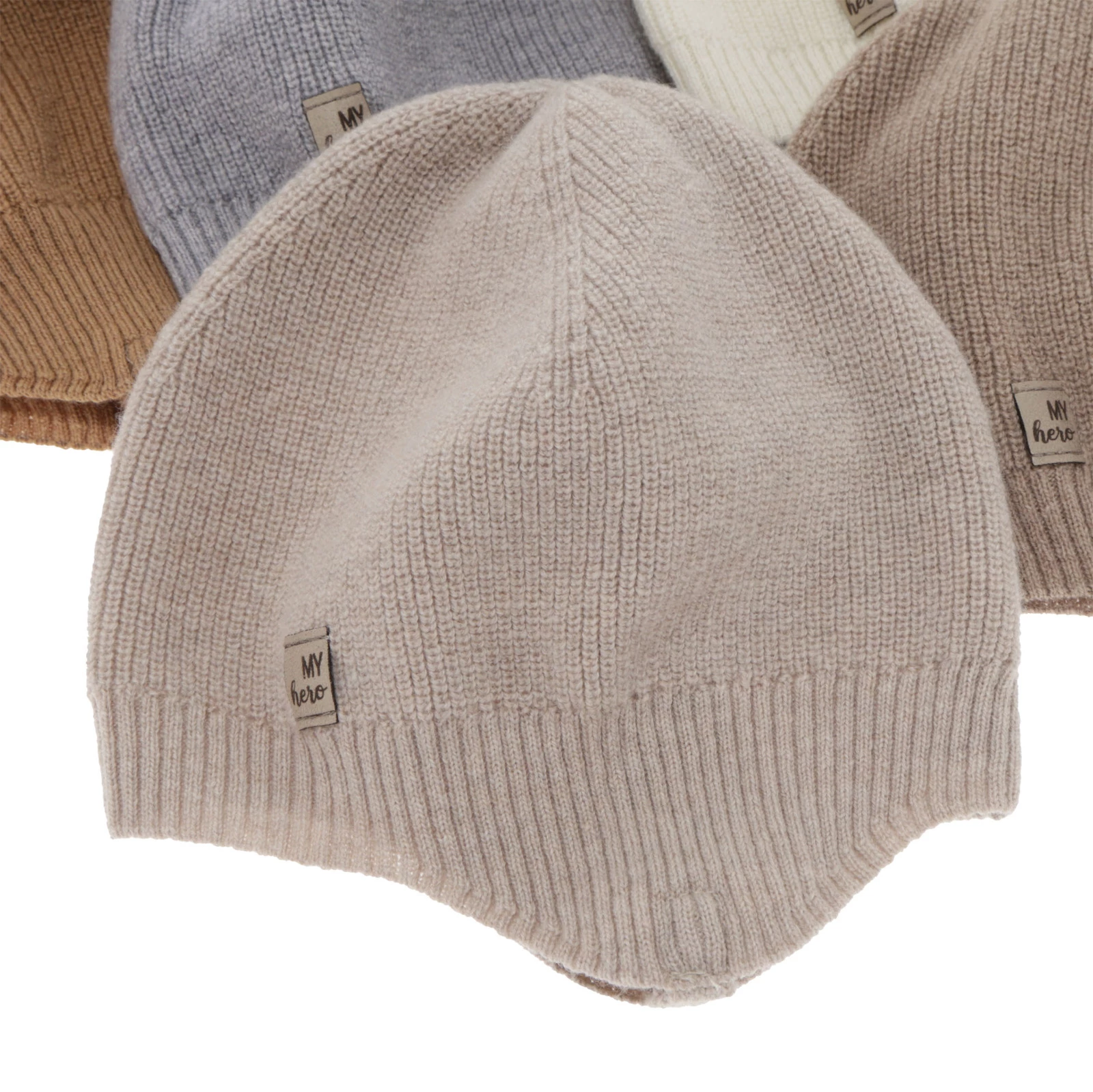 Czapka jesienna, wiosenna dla chłopca, jasnobeżowa, wełna merino z kaszmirem, wiązana Tono