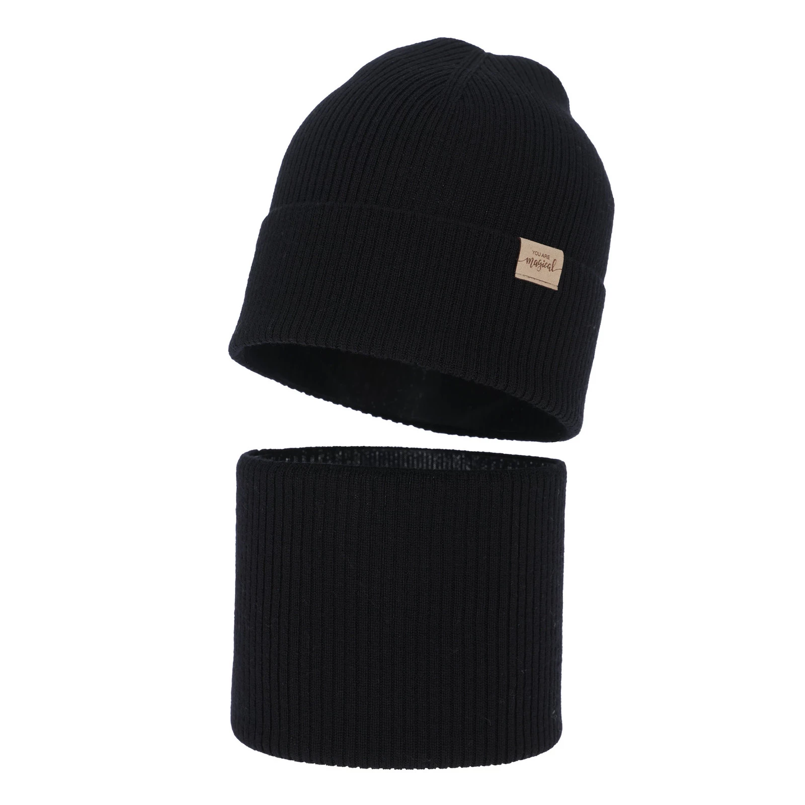 Czapka i komin dla dziewczynki jesienny, wiosenny komplet, czarny, 100% wełniany merino Magenta