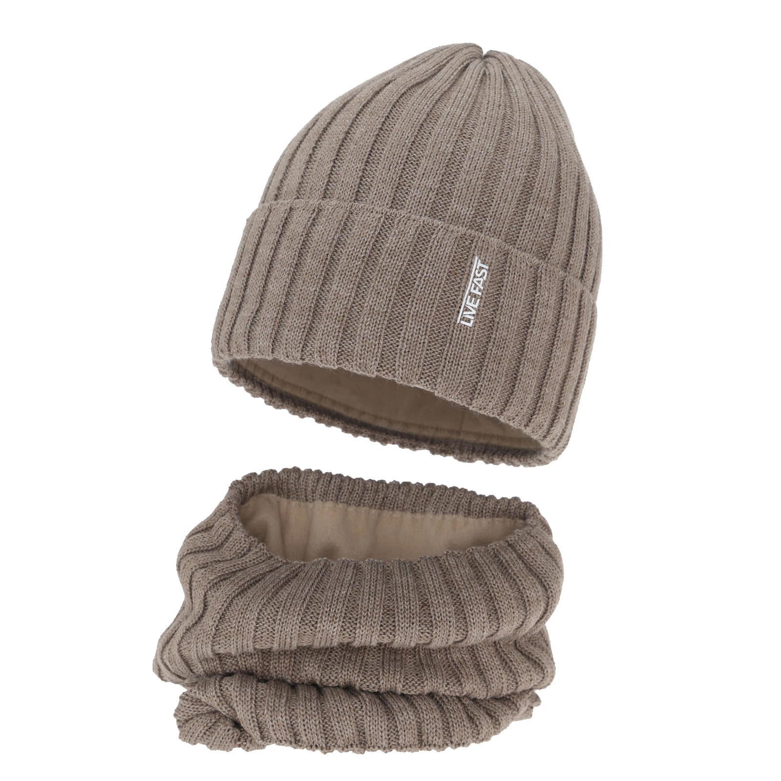 Czapka i komin dla chłopca zimowy komplet, beżowy, z wełną merino, podszyty polarem Banasko